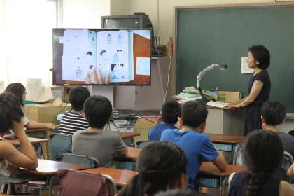 6年生は何と、書画カメラを活用しての読み聞かせ!