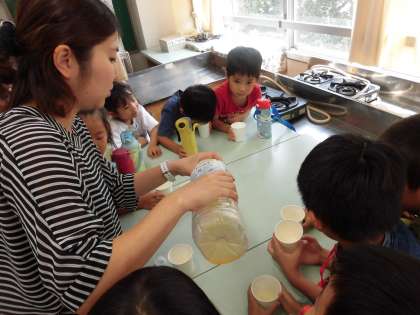 生活の時間に作った梅ジュースと杏子ジュースを飲みました。