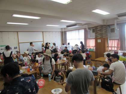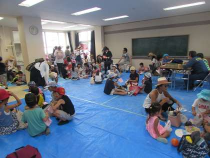 おまつりの途中ですが、熱中症対策として外のお店は一度閉じ、クーラーの効いた部屋で子どもたちに水分補給や休憩を摂ってもらっています。