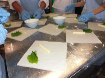 2.青じその葉を置き、その上にささみ、たけのこ、生しいたけなどを炒めて味付けした具をのせ、さらにスティックチーズを置いて包みます。