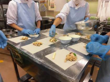 今日は少し変わった春巻きを作りました。給食には年に1・2回しか登場しませんが、子どもたち、特に高学年には人気の一品です。作っている様子をご紹介します。