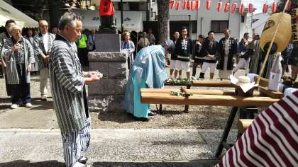 朝から若林町会の河野会長をはじめとした方々が若林稲荷に集まり、お神輿の準備が始まります。
