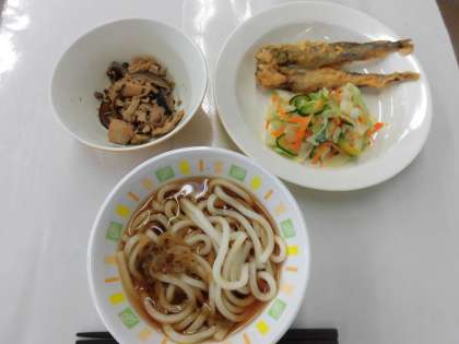 【献立】冷やしきつねうどん・ししゃもの天ぷら・ひと塩野菜・牛乳