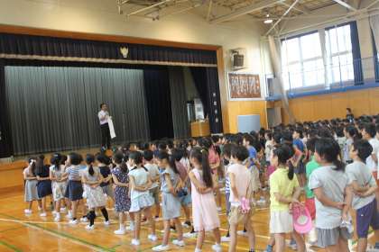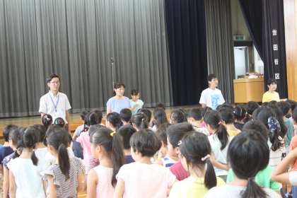 みんなよい姿勢で、静かにお話を聞くのが若小の伝統。
