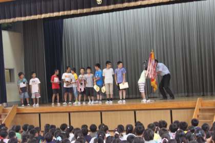 朝会の中で、若林クラブの野球チームが表彰を受けました。