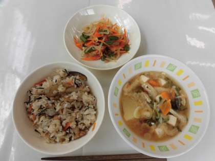 【献立】ひじきごはん・野菜の辛子じょうゆかけ・みそ汁・牛乳