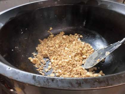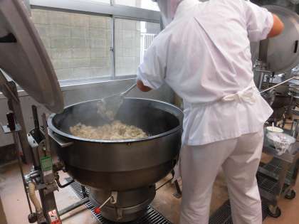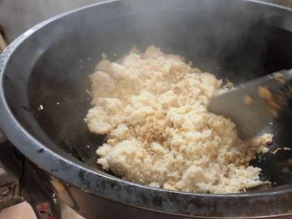十五夜は芋名月とも言われるため、主食は里芋ごはんです。具はあらかじめ煮て小分けし、これを大きな回転釜に戻し入れてもう一度火を入れてあたためます。ここに炊き上がったごはんを加えて、具とごはんをよくまぜます。