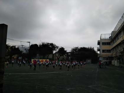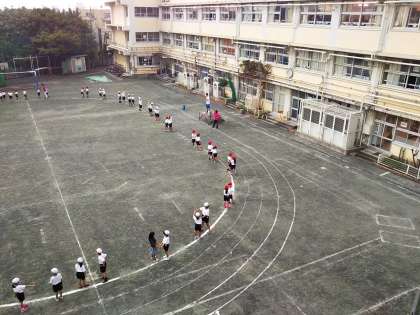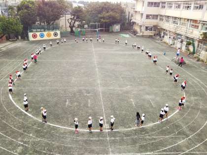 かわいい1年生たちが、校庭に大きな円を描いています。
