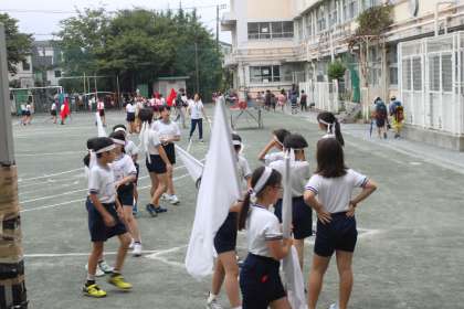 ハチマキと旗がなんとも誇らしい、若小の応援団です。