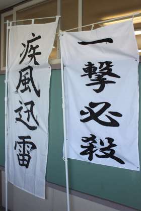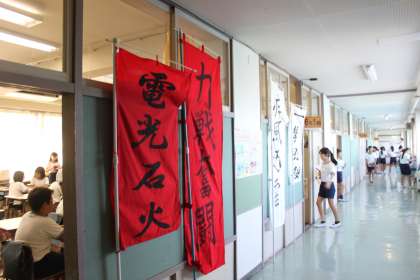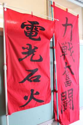 6年生の教室前には、騎馬戦で使うのぼりが掲示されています。
