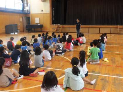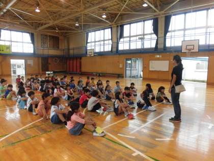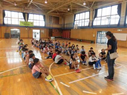 運動会で大活躍をした低学年リレーの選手が体育館に集まっています。
