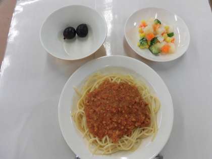 【献立】スパゲティーミートソース・マセドアンサラダ・ぶどう・牛乳
