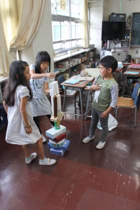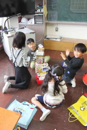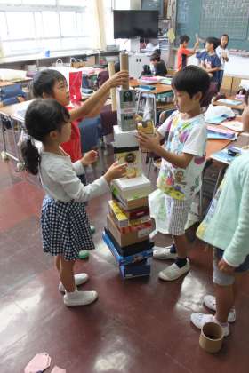 お家から持ってきた箱を積み重ねて、高い塔をつくります。