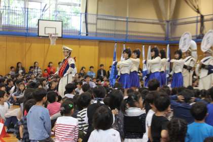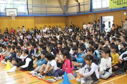体育館に集まった全校児童の前に、ダッキーズの皆さんの登場に大きな拍手が贈られました。