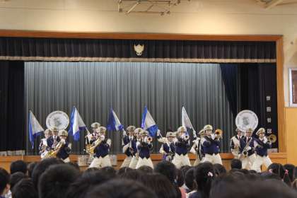 今日の2、3時間目に、駒澤大学吹奏楽部マーチングバンド「ダッキーズ」の皆さんをお招きして、恒例の音楽鑑賞教室を行いました。