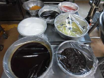 カレーに入れる調味料です。手前左から、中濃ソース、フルーツチャツネ、塩、炒め油、しょうゆ、カレー粉、トマトピューレです。
