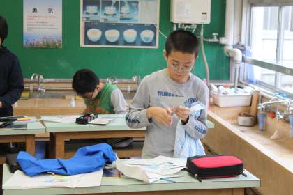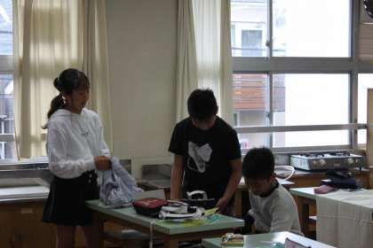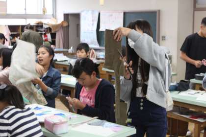 6年生が家庭科の時間に、ミシンを使ってパッチワークをしました。