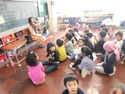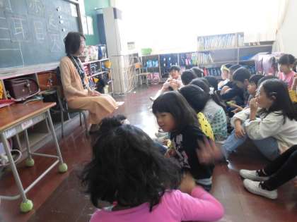 本日、講師の先生によるお話し会がありました。グリム童話では、みんなの知っているお話と違うところもあり、子どもたちの興味も釘づけでした。