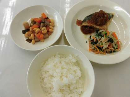 【献立】ごはん・さばの黒酢煮・おひたし・五目豆・牛乳