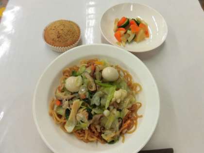 【献立】あんかけ焼きそば・シャキシャキ野菜・紅茶ケーキ・牛乳