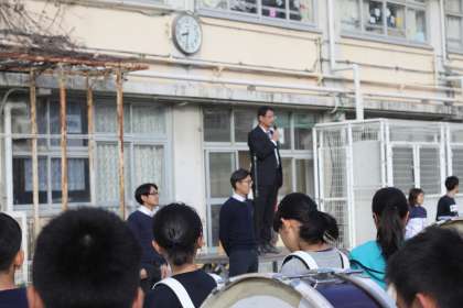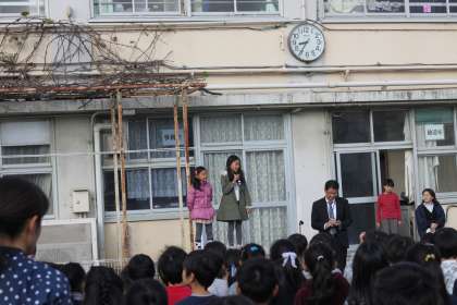 校長先生は3年生と一緒に社会科見学に行っているので、代わりに副校長先生がお話をします。