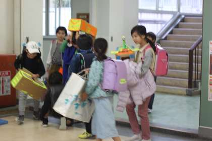 展覧会が終わり、さっそく作品を持ち帰る子どもたちの様子です。