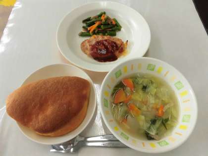 【献立】ミルクパン・アップルチーズハンバーグ・いんげんソテー