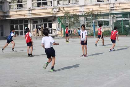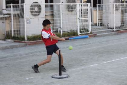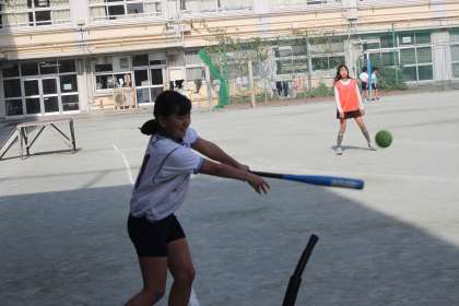 6年生は体育の時間に、男女混成チームでティーボールを行いました。