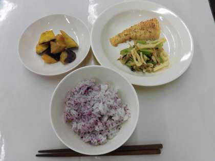 【献立】ゆかりごはん・いかの七味焼き・カリカリ油揚げと野菜のひたし
