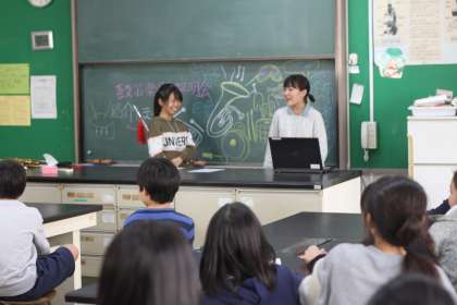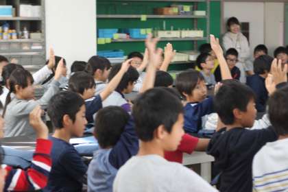 みんなで静かに聞き入る5年生に向けて、準備しておいたプレゼンがさく裂!