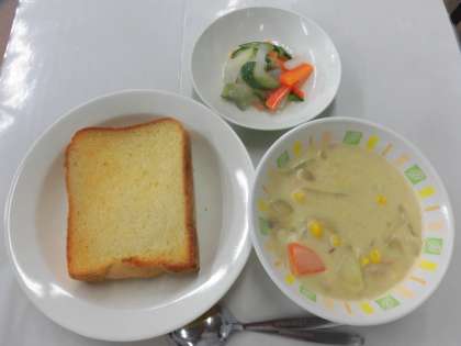 【献立】ガーリックトースト・コーンシチュー・ピクルス・牛乳