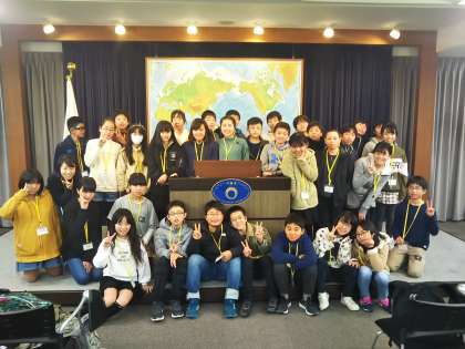 外務大臣がつい先程まで使っていたというプレスルームで記念撮影。