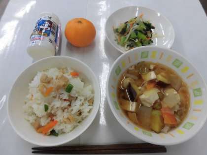【献立】こぎつねごはん・おひたし・さつま汁・みかん・のむヨーグルト