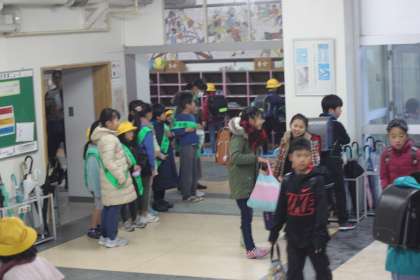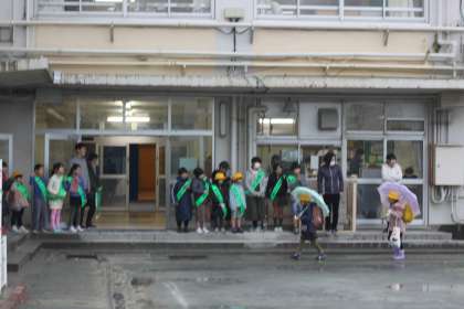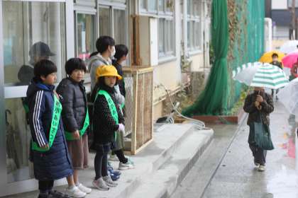 今朝は雨の朝になってしまいましたが、4班の子達が朝のあいさつ運動を行いました。