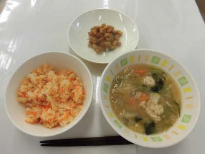 【献立】あけぼのごはん・肉団子入りみそ汁・大豆とじゃこの甘辛揚げ・牛乳