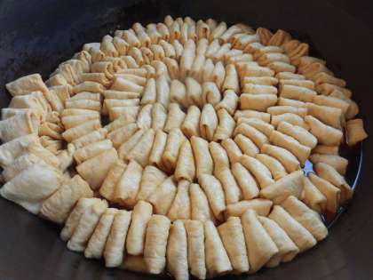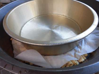 回転釜にお餅の入った油揚げを並べて、コトコトと煮ました(約1時間)。オーブンペーパーを落し蓋にし、さらにプカプカ浮いてこないように、大きなたらいをのせました。