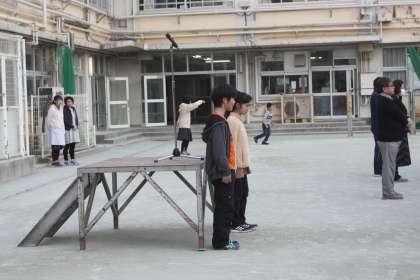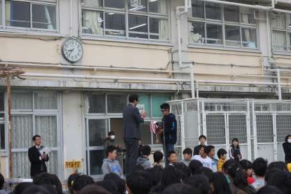 6年生の代表児童に続いて、全校でしっかりと挨拶をしました。