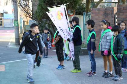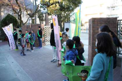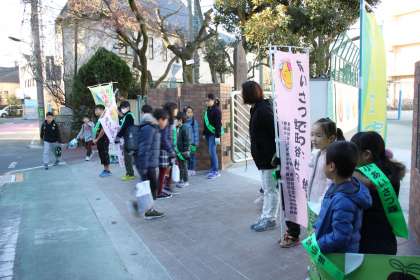 やる気あふれる5班の子達が正門前で元気にあいさつをしています。