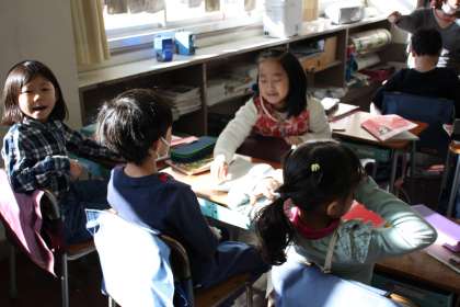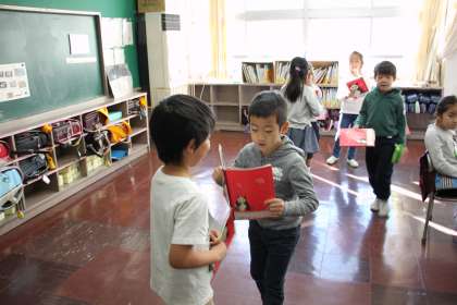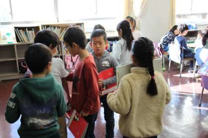 1年生が国語の時間につくった詩を、お互いに紹介し合っています。