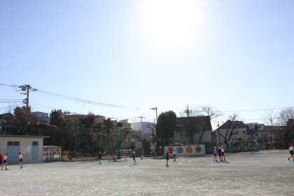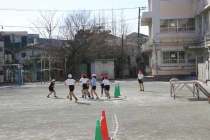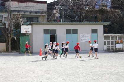 校庭では3年生たちが元気いっぱいにラインサッカーをしています。