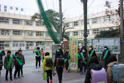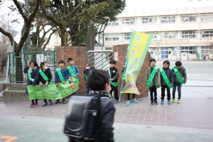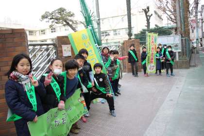 たくさんの子が参加して盛り上がるあいさつ運動。