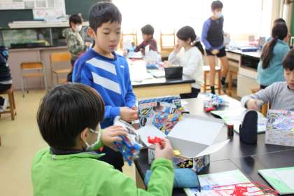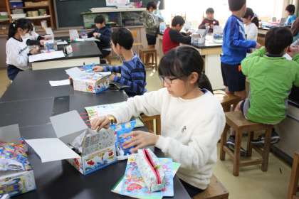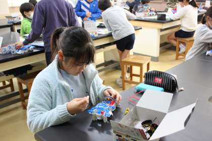 本当に動くのか、ワクワクしながら組み立てる5年生。