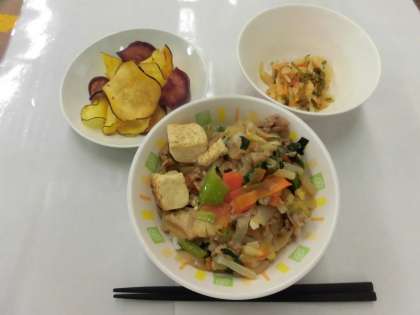 【献立】すき焼き風どんぶり・はりはり漬け・さつま芋チップス・牛乳