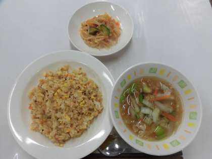 【献立】そぼろごはん・もやしのコチュジャンかけ・白菜と春雨のスープ・牛乳