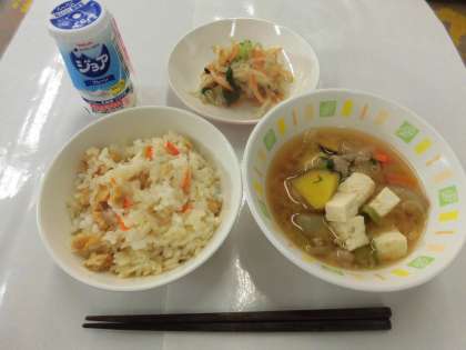 【献立】こぎつねごはん・おひたし・さつま汁・のむヨーグルト