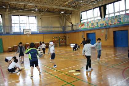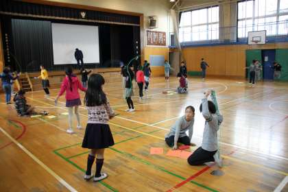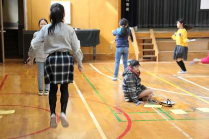 休み時間の体育館には、若小チャレンジ短なわに参加する子たちがたくさん来ています。