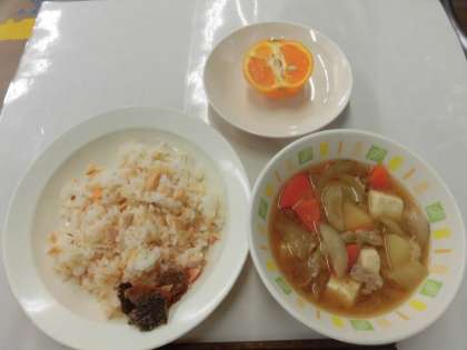 【献立】鮭ごはん・豚汁・ぽんかん・牛乳