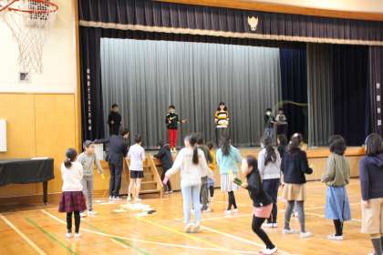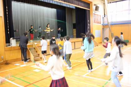 体育館ではCDに合わせて連続跳びの検定が行われています。