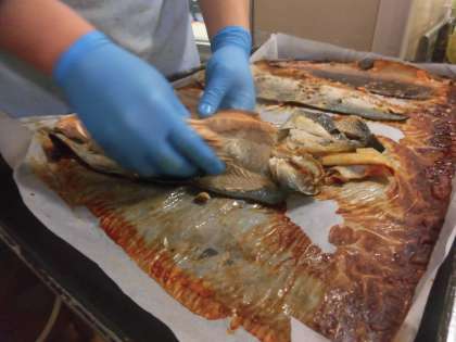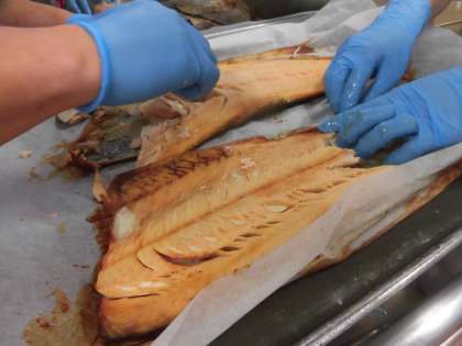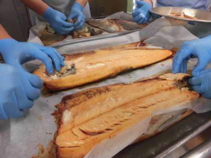鮭が焼けたら、少々冷ましてから、まずは皮と身を分けます。皮が細かくちぎれてしまわないように注意しながら作業を進めます。