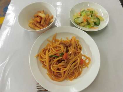 【献立】スパゲティーナポリタン・野菜のイタリアンドレッシングかけ